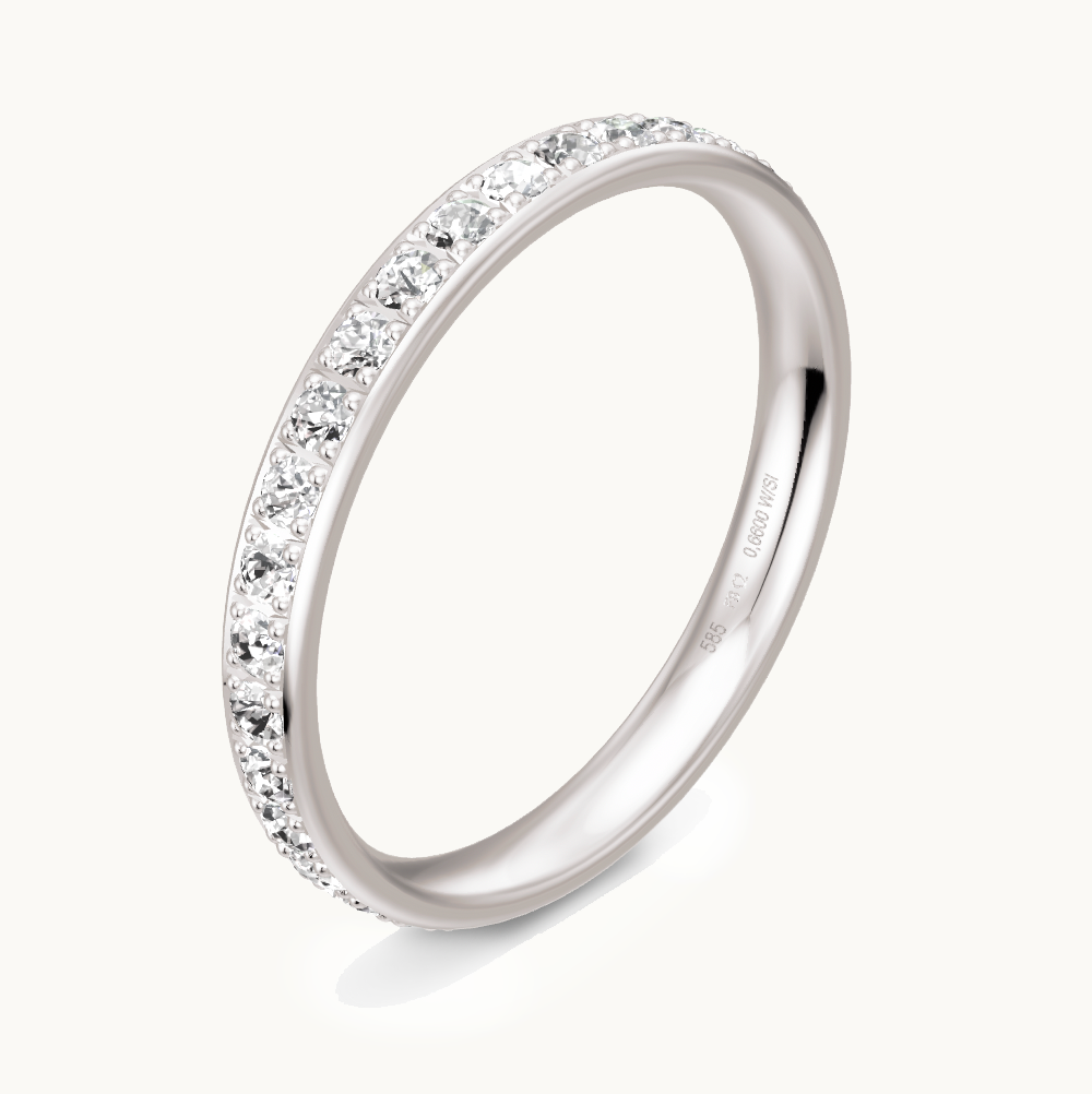 Dieser Weißgold-Trauring mit glänzenden Brillanten ist perfekt, um mit einem vorhandenen Verlobungsring kombiniert zu werden. Die handgefassten Brillanten schmücken den Ring wie ein ewiges Band und unterstützen ein Solitaire im Bereich von 0,40 bis 1,00 Karat. Die Form wurde so gestaltet, dass sie den Verlobungsring optisch ergänzt, ohne zu dominieren. Wir können den Ring je nach Form, Farbe und Größe des Verlobungsringes modifizieren, damit er perfekt dazu passt. Beachte bitte, dass dieser Ring nach deinen Wünschen angefertigt wird und daher eine Rückgabe oder Umtausch ausgeschlossen ist. Die Ringgröße kann aufgrund der Brillanten nicht geändert werden, daher empfehlen wir eine umfangreiche Beratung vor Ort, damit du die optimale Ringgröße finden kannst.