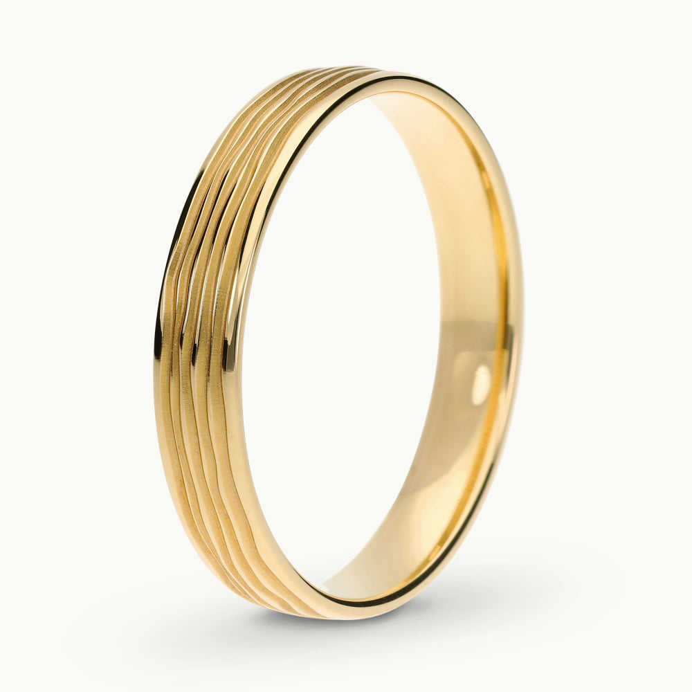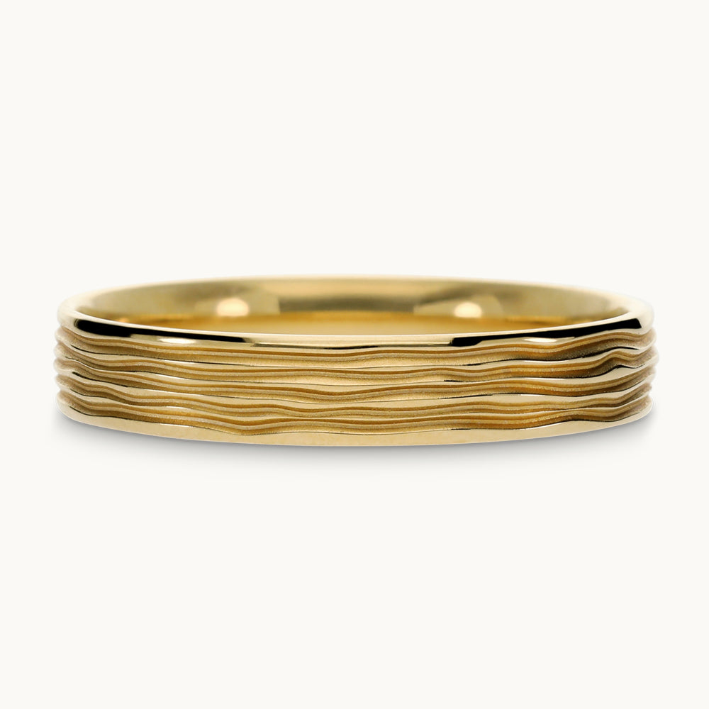 Mittelgold steht für Wärme und Ausgewogenheit. Die Wellenstruktur erinnert daran, dass Beständigkeit aus Bewegung entsteht. Glanz und matte Tiefe verbinden sich zu einem Design, das Ruhe und Lebendigkeit in Balance hält.