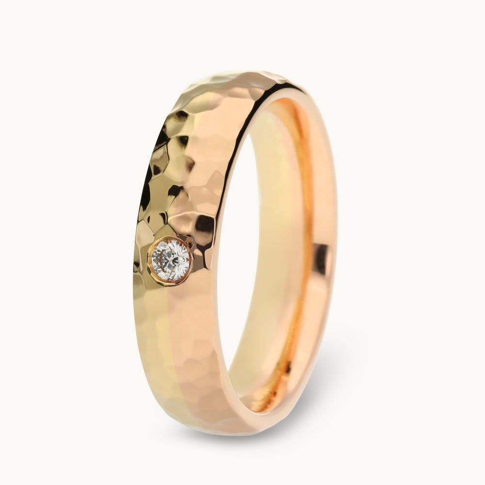Die gleichwertige Verbindung von Gelbgold und Rotgold steht für Balance und Zusammenhalt. Der mittig gefasste Brillant symbolisiert Klarheit und Beständigkeit – ein ruhiger Mittelpunkt innerhalb eines lebendigen Gesamtbildes.