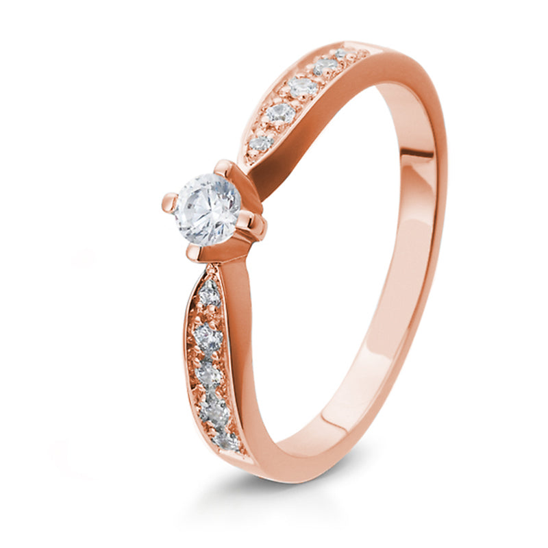 Dieser Verlobungsring aus Rotgold ist wunderschön und feminin gestaltet. 10 Brillanten mit einem Gewicht von 0,107 ct. sind an der schmalen und markanten Ringschiene dezent angeordnet und unterstreichen die Eleganz des Rings. Der Hauptbrillant hat ein Gewicht von 0,12 ct. und ist mit 4 Krappen gefasst.