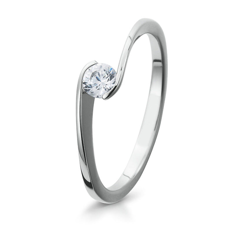 Verloben Sie sich mit diesem zauberhaften Verlobungsring. Seine feine Ringschiene ist schwungvoll geformt und durch einen atemberaubenden Brillanten 0,20 ct., Weißgold umfasst. Ein besonderes Symbol Ihrer Liebe.